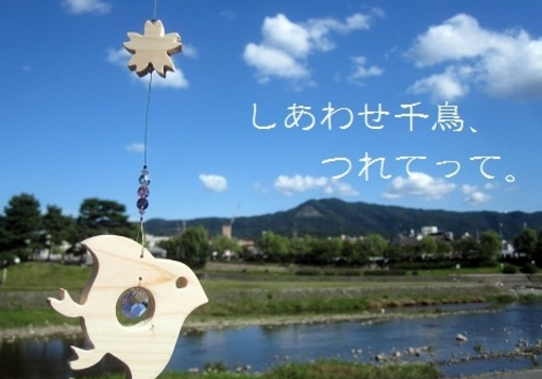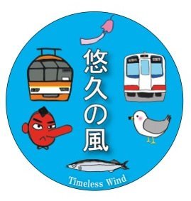 叡電と三鉄を並べ、背景の水色で涼やかな風と三陸の海、鞍馬の空をイメージ。鞍馬のシンボル天狗、三陸の鳥「うみねこ」、良い縁と絆を結ぶ「ピンクの風鈴」下には三陸の名産「さんま」を泳がせてみました。